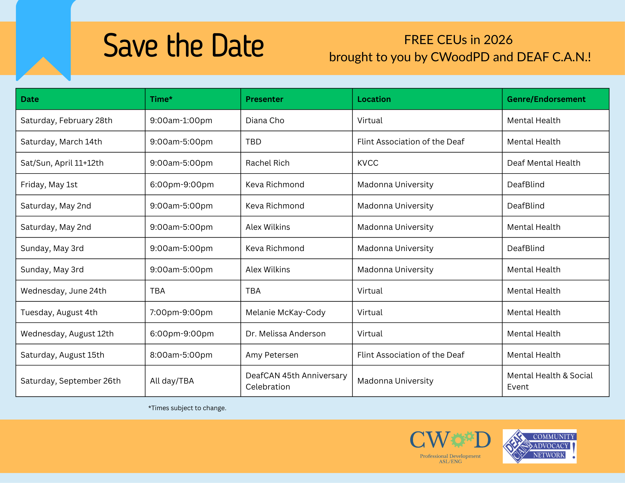 Saturday, September 26 | All day/TBA | DeafCAN 45th Anniversary Celebration | Madonna University | Mental Health & Social Event |